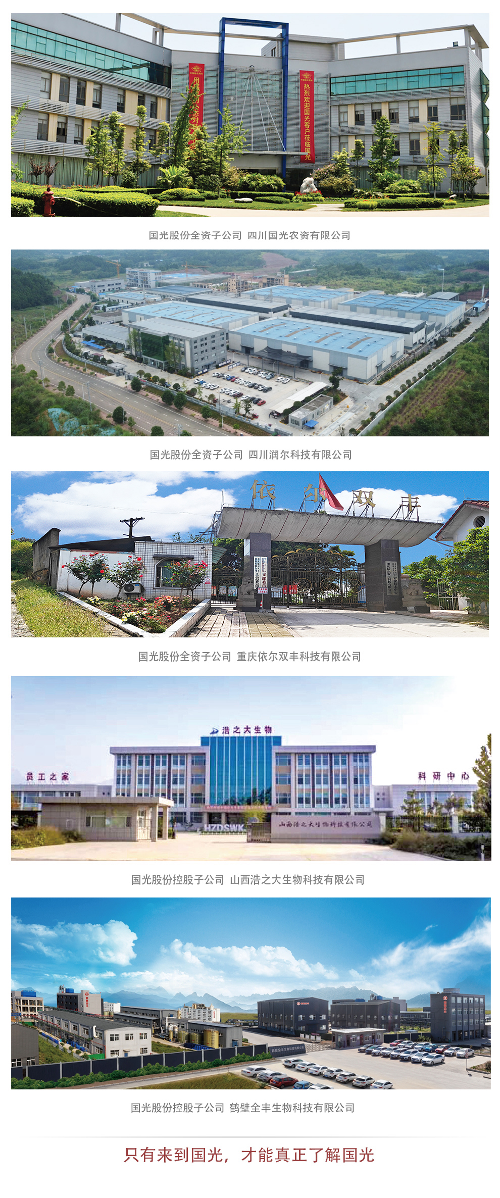 公司下屬的四川國光農(nóng)資有限公司、四川國光園林科技有限公司、四川潤爾科技有限公司、重慶依爾雙豐科技有限公司、山西浩之大生物科技有限公司、鶴壁全豐生物科技有限公司、四川蕓領(lǐng)農(nóng)業(yè)技術(shù)服務(wù)有限公司、成都國光現(xiàn)代農(nóng)業(yè)職業(yè)技能培訓(xùn)學(xué)校有限公司等十五家公司分布于四川省、山西省、河南省、海南省、重慶市等省(直轄市),并在全國設(shè)有二十五個(gè)物流倉儲(chǔ)服務(wù)中心。公司堅(jiān)持“敬業(yè)、高效、務(wù)實(shí)、創(chuàng)新”的企業(yè)精神,聚焦調(diào)節(jié)劑、水溶性肥料、園林養(yǎng)護(hù)品等優(yōu)勢品類,堅(jiān)持“全員服務(wù)、創(chuàng)造價(jià)值;全心服務(wù),成就用戶”的服務(wù)理念,突出技術(shù)服務(wù)的核心作用,產(chǎn)品在配合綠色防控、提質(zhì)減量、抗災(zāi)減害、減少人工、配合機(jī)械化等方面起著重要作用,“國光”“雙豐”“浩之大”“國光園林”“鶴壁全豐”品牌影響力持續(xù)擴(kuò)大。