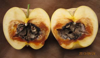 只危害果實。分為霉心型和心腐型。初期心室組織變褐壞死,后向外擴(kuò)展,果肉變褐色或者深褐色,味苦,可從果柄洼出爛透。心室內(nèi)充滿白色、黑褐色、青綠色或者粉紅色霉層,以粉紅色霉層最常見。幼果發(fā)病,內(nèi)外常包敷紅粉。北斗、元帥系品種的病果易脫落,青香蕉的病幼果多在樹上變黃,國光則干縮成黑色小僵果,掛在樹上經(jīng)冬不落。
