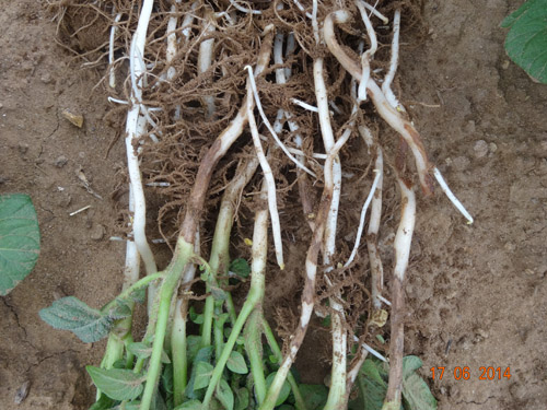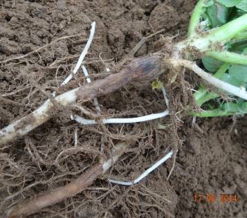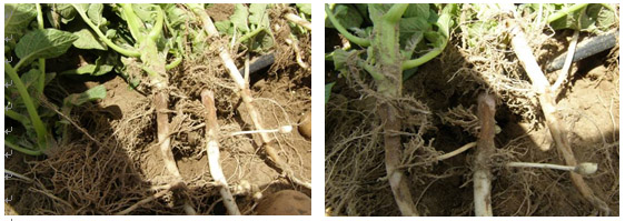 試驗(yàn)背景:隨著馬鈴薯面積的擴(kuò)大,連作障礙土傳性病害越來越嚴(yán)重,特別是像黑痣病、枯萎病近2年發(fā)生特別嚴(yán)重,而且治療非常困難。市面上防治這類病害的藥劑效果好的很少。2014年由于前期地溫比較低、濕度大,黑痣病感染比較嚴(yán)重,有的甚至已經(jīng)感染匍匐莖,嚴(yán)重影響到馬鈴薯的生長(zhǎng)。
