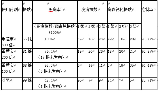 2、 用藥處理后,大多數(shù)植株病斑已鈣化,病情發(fā)展得到控制,其中重茬寶200ml/畝控制率達(dá)到96.42%,其中對(duì)發(fā)病較輕的植株(1級(jí)、2級(jí))控制率達(dá)到100%。