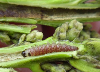 癥狀:該蟲以芒果嫩葉為食料,每年5~11月均有發(fā)生,主要以幼蟲危害嫩葉、葉柄和主脈,被害葉呈褐斑狀,與葉斑病近似,葉背面有小點(diǎn)凸起,后期穿孔破裂,葉片卷曲,嚴(yán)重時(shí)致辭使葉片枯萎脫落甚至梢枯,造成植株生長衰弱。