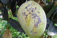 癥狀:介殼蟲為害葉片、枝條和果實(shí)。幼蟲和雌成蟲群集在芒果葉背或果實(shí)的表面,用口器插入組織內(nèi)吸取汁液,被害部分產(chǎn)生黃色的斑點(diǎn),嚴(yán)重影響果皮的質(zhì)量。其排泄物能引起煤污病。