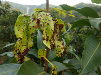 癥狀:主要危害新梢,花穗,幼果和壯果,此病可引起葉斑、梢枯、落花、落果和果腐,并有明顯潛伏現(xiàn)象。葉片感病后現(xiàn)不定形圓形或半圓形褐斑。枝梢、花穗染病變褐色枯死,梢期表現(xiàn)為葉片上病斑初期為小黑點(diǎn),逐步擴(kuò)大干枯穿孔,影響光合作用;花期容易在花桿部造成逐步擴(kuò)大病斑、干花;危害幼果和采收前的果實(shí)、果面現(xiàn)形狀不一稍凹陷的紫褐色至黑色病斑,潮濕時(shí)現(xiàn)朱紅色粘質(zhì)小點(diǎn),隨后病斑連成斑塊,至全果變黑腐爛、幼果皺縮脫落。