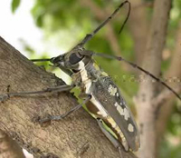 防治方法: 防治脊胸天牛主要有捕殺成蟲、清除卵塊和消滅幼蟲3個(gè)環(huán)節(jié)。1、每年4~5月是成蟲大量羽化及飛出交尾、產(chǎn)卵的時(shí)間,應(yīng)加緊巡園觀察,發(fā)現(xiàn)成蟲遷飛時(shí)可用捕蟲網(wǎng)加以捕殺。2、天牛產(chǎn)卵在枝梢上時(shí)往往先咬破嫩梢上的樹皮,然后將卵粒產(chǎn)在其中,且卵粒較大,容易被發(fā)現(xiàn)。發(fā)現(xiàn)卵粒時(shí)要立即將其摘除銷毀,以減少幼蟲孵化鉆蛀危害的機(jī)會(huì)。3、發(fā)現(xiàn)天牛蛀道的孔洞,可用鐵線穿刺孔道鉤殺幼蟲,也可用56%磷化鋁片劑,或以毒死蜱等藥液堵塞蛀道孔內(nèi),然后用泥團(tuán)(或棉簽)封閉洞口,將幼蟲毒殺于蛀道內(nèi)。