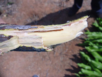 發(fā)病規(guī)律:病原為半知菌亞的擬莖點(diǎn)霉(Phompsis mangiferae Ajmad)、小穴殼菌(Dothiorella dominica)和球二孢菌(Botryodiplodia theobromae)以擬莖點(diǎn)霉為多見。病菌均以菌絲體和分孢器在病株和病殘物上存活。氣溫適宜時(shí),分孢器涌出分生孢子,借雨水傳播進(jìn)行初侵與再侵。果實(shí)病蟲害或機(jī)械傷口,更易發(fā)病。
