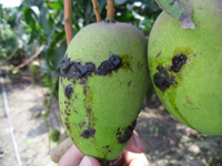 發(fā)病規(guī)律:病原為半知菌亞門擬莖點(diǎn)(Phomopsis mangiferae)和色二孢霉(Diplodia mangiferae)病菌均以菌絲體和子實(shí)體(分孢器)在病株和病殘?bào)w上存活。氣溫適宜時(shí),分孢器涌出大量分生孢子,借風(fēng)雨傳播,主要從傷口侵入致病。溫暖多濕有利于病菌繁殖傳播侵染,植株、果實(shí)病、蟲傷口多樹勢哀落的果實(shí)發(fā)病較重。