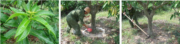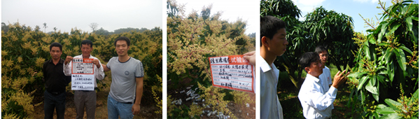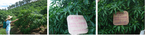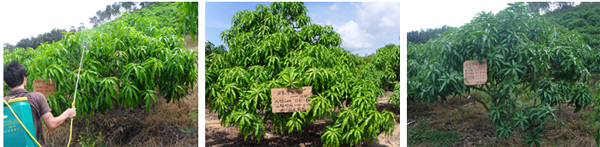 海南三亞福田公司種植戶李伯真18889889828,在2010年6月4日,使用15%國光多效唑可濕性粉劑對(duì)金煌芒、澳芒、貴妃芒(樹冠直徑3.5米,樹直徑14cm,土埋60g15%國光多效唑可濕性粉劑;樹冠直徑4.5米,樹直徑14cm,土埋15%國光多效唑可濕性粉劑80g)進(jìn)行土埋處理。后期表現(xiàn)效果:控梢穩(wěn)定,不“沖梢”;葉片濃綠加厚;枝梢生長短壯。圖為福田公司果園。
