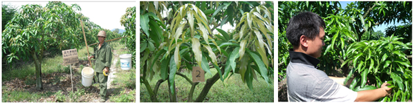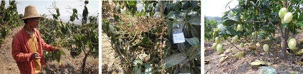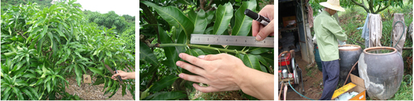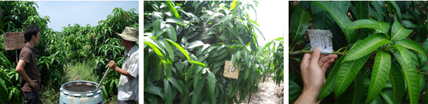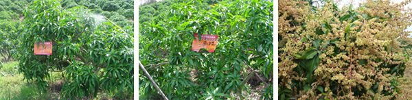 海南三亞英州鎮(zhèn)種植戶蔡桂香,在2010年5月20日,使用國光烯效唑、國光萘乙酸(5%水劑)對(duì)臺(tái)農(nóng)芒進(jìn)行葉面控梢處理。后期表現(xiàn)效果:不“沖梢”,催花容易,出花整齊。圖為蔡貴香果園。