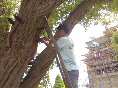 這兩棵古樹差不多有三層樓高,樹根盤枝錯節(jié),樹體朝一側傾斜著,被工作人員用鋼管支架精心支撐住。據(jù)了解,2013年,永寧縣林業(yè)局邀請自治區(qū)林業(yè)廳、銀川市園林局專家對這兩棵刺槐的樹齡進行鑒定,專家根據(jù)兩棵樹的高度、直徑,結合樹種的正常生長速度進行估算,結論是兩棵刺槐樹齡均已過百年。